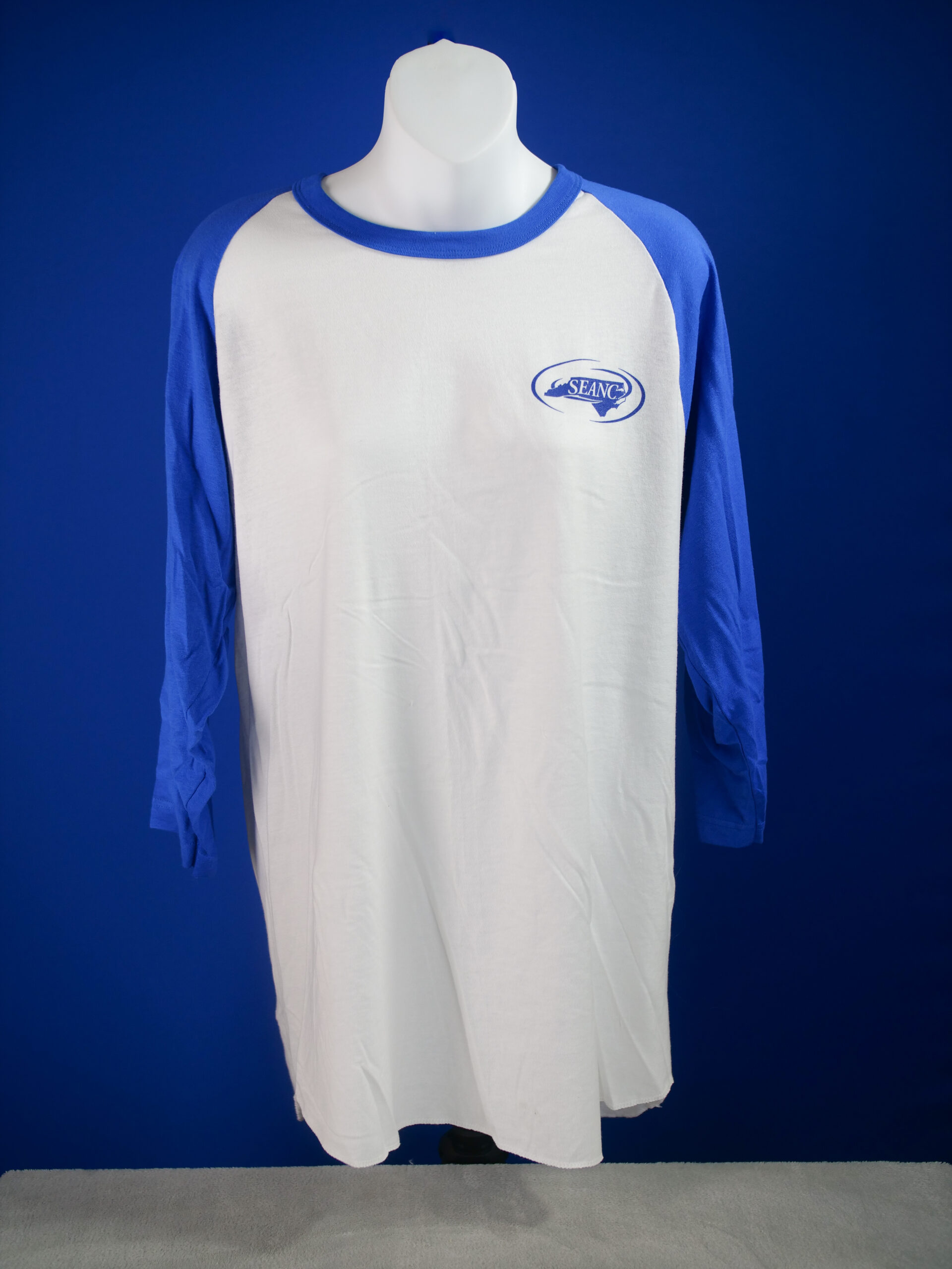 Unisex Royal Blue and White Baseball Shirt with SEANC logo on left side.